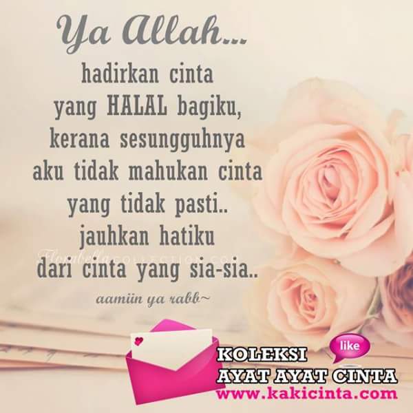 Dan kau dekatkanlah kami dengan sebuah ikatan yang halal. Memang pantas untukku sampai takut kehilangan. Mungkin ungkapan ini sesuai dengan situasi bagi mereka yang telah menemui seseorang atau mungkin bukan juga seseorang tetapi yang cukup istimewa untuk di jadikan sebagai peneman hidup di dunia mahupun. "orang yang cerdas tidak boleh khawatir akan jodohnya. Carilah seseorang untuk cari tahu tentang dia. jika ada kekuatan taaruflah dengan dia. "ya allah, jika dia jodohku tolong dekatkanlah, jika dia bukan jodohku, tolong tulis dia sebagai jodohku" "jika ia bukan jodohku, ya allah" Sertai usrah,jaga hubungan dengan allah, dengan keluarga dan orang terdekat. Kalau dia betul jodoh kita, allah permudahkan. Sabar karena jodoh tak akan ke mana." jika dia bukan jodohku, maka jangan biarkan dia dimiliki. jika dia bukan jodohku, ya allah janganlah membuatku selalu rindu mengaitkan hati padanya.